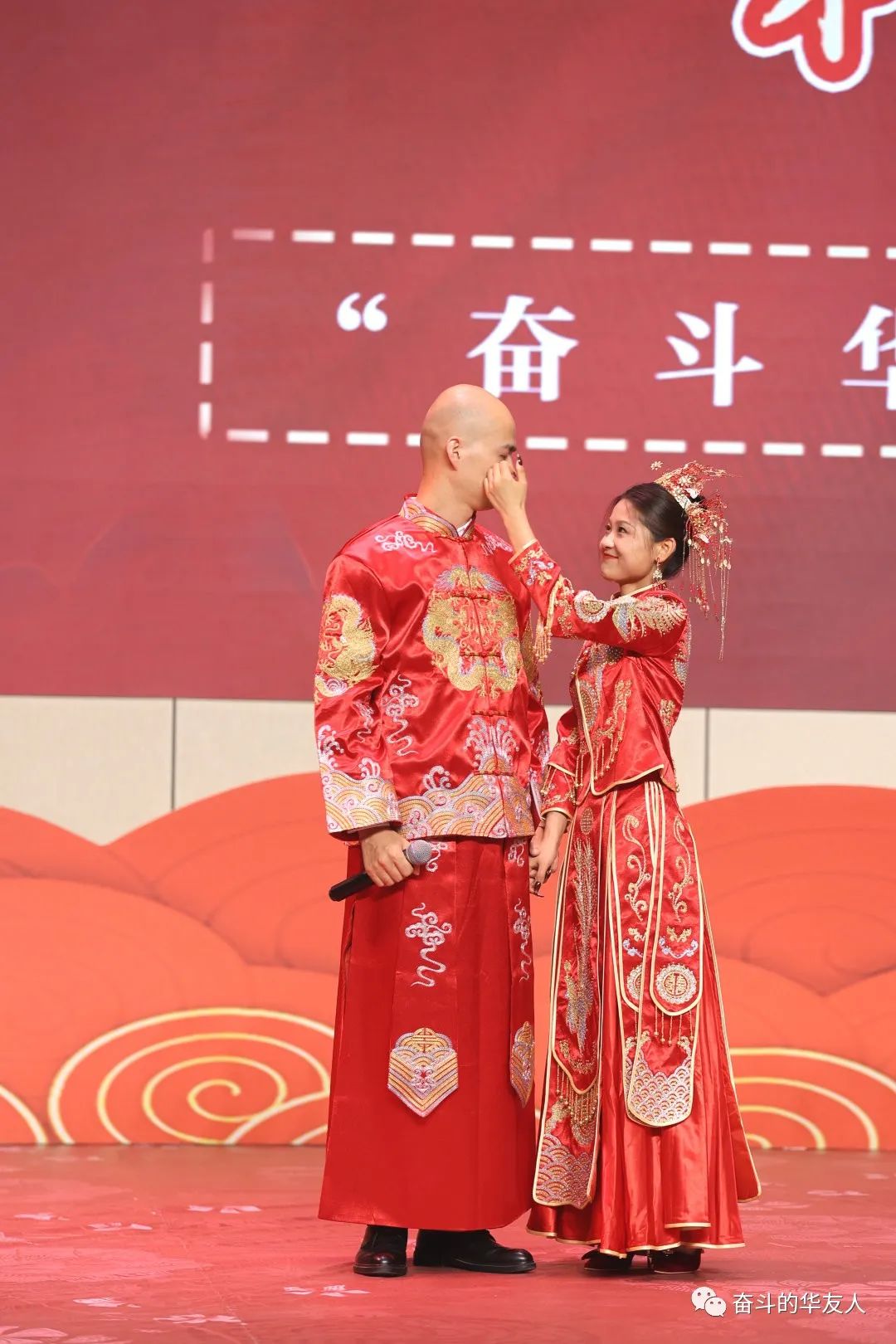 “樂起,禮請新娘入喜堂”。只見五位新娘蓋著紅蓋頭緩緩步入禮堂,而新郎們在仔細端詳片刻后便徑直走向他們的新娘,認準后就在新娘面前站定,挑起紅蓋頭。這便是“聞香識人情定終身”環(huán)節(jié)了。五對新人手執(zhí)紅綢、相對一笑、踏過紅毯、步入殿堂。此時他們心靈相通、只有彼此。臺上視頻里播放著每對新人專屬的愛情故事,臺下華友的家人們共同聆聽他們的愛情,忍不住被這種細膩、美好的情感所感動,為他們而感到幸福。