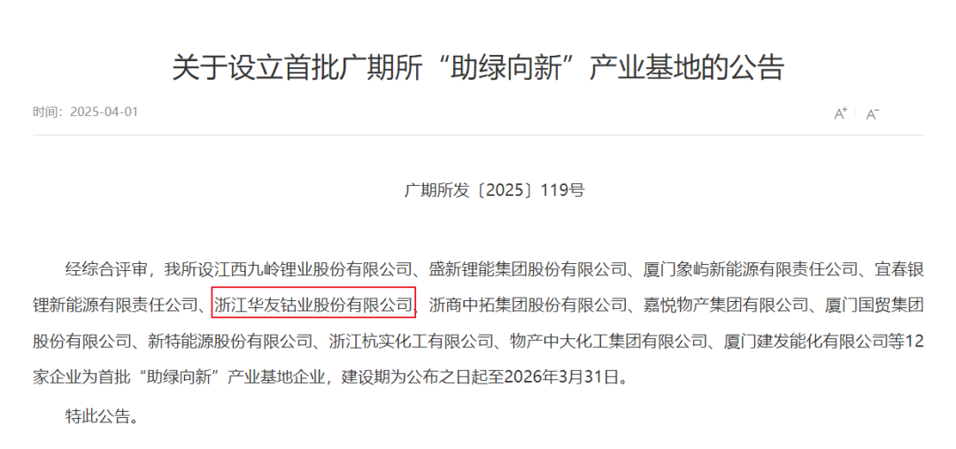 Among the first batch of "Green Innovation Support" industrial bases announced, there are a total of 6 enterprises related to lithium carbonate. This approval acknowledges Huayou Cobalt's efforts in promoting the development of the new energy industry and its deep exploration and utilization of new energy futures tools.