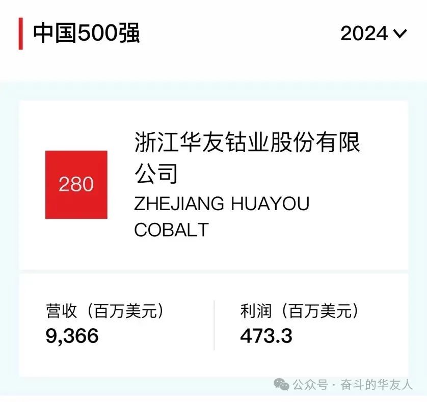 《財富》中國500強(qiáng),華友鈷業(yè)位居第280位!